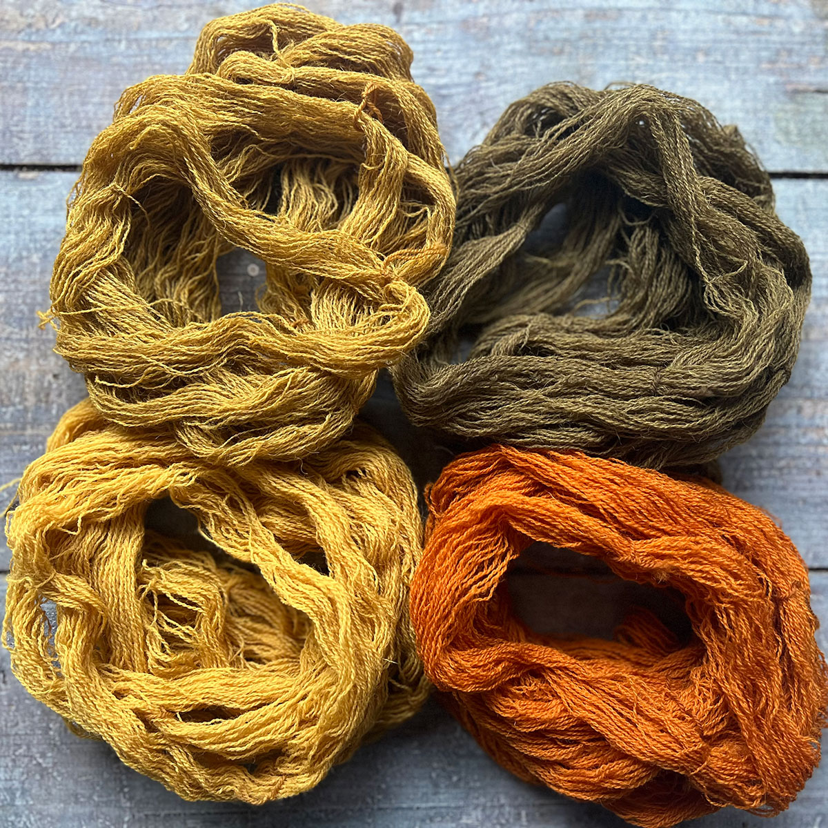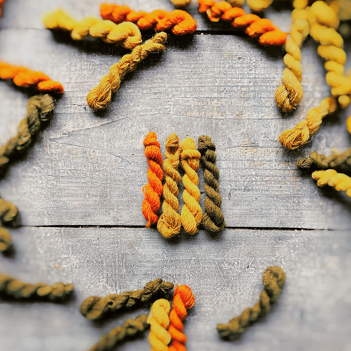 Ein Set aus 4 kleinen Strängen Stickgarn in abgestimmten Orange-/Gelb- und Grüntönen. Das Garn ist 2fädig aus 100% Wolle von norddeutschen Schwarzkopfschafen. In meiner Hofwerkstatt hab ich das regionale Garn mit Dahlienblüten aus dem eigenen Garten handgefärbt. Das Garn eignet sich perfekt für Stick auf Strick, kann aber auch einfach oder doppelfädig für Stickarbeiten auf Leinen und Co verwendet werden.
